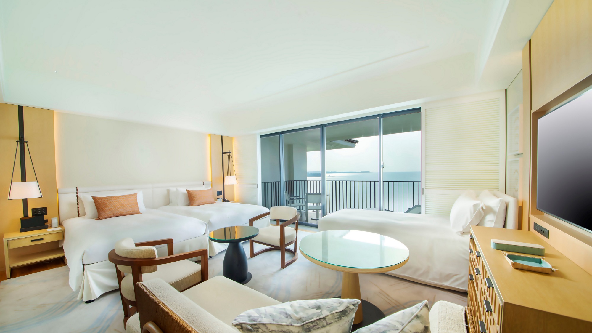 でも、ハレクラニ沖縄のお部屋はスタンダードでも50平米とゆとりのある作りなので、トリプル仕様でも問題なし!私たちも「プレミアクラブ オーシャンフロント」の50平米のお部屋を3人で利用しましたが、狭苦しさを感じることが一切なく2泊滞在できました。